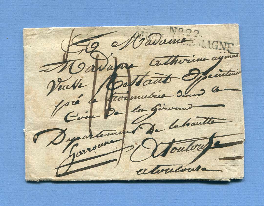 ARMEE D’ALLEMAGNE – … (?), Antoine. Caporal in einem Infanterieregiment. – Brief an seine Mutter in Toulouse. MAGDEBURG, 2. Oktober 1811. 3 pp. in-4, Adresse mit Stempel No 22 ARM. D’ALLEMAGNE, geringe Fehlstellen.
